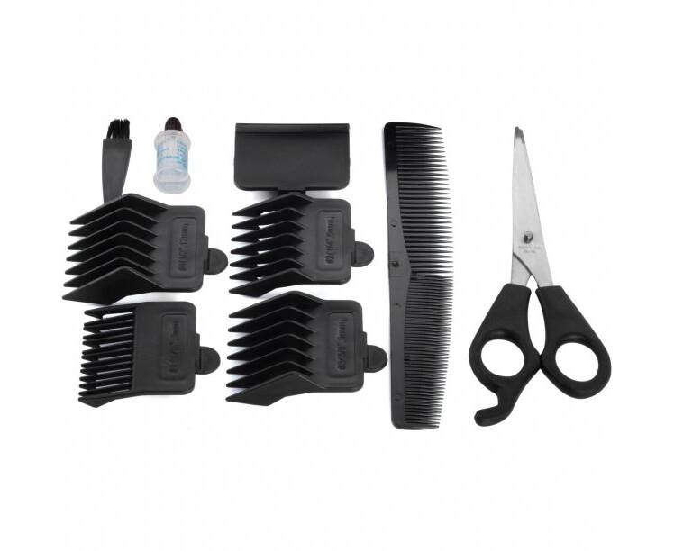 4 сменных наконечника: 3, 6, 9 и 12 мм (1 ножницы, 1 масло, 1 щетка, 1 длинная расческа)