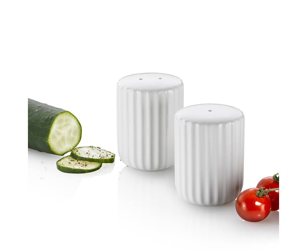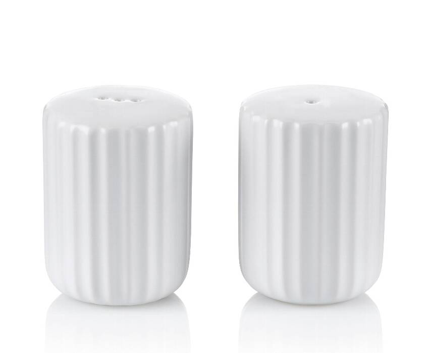 Набор для соли и перца изготовлен из матовой керамики и заполняется через отверстие в нижней части