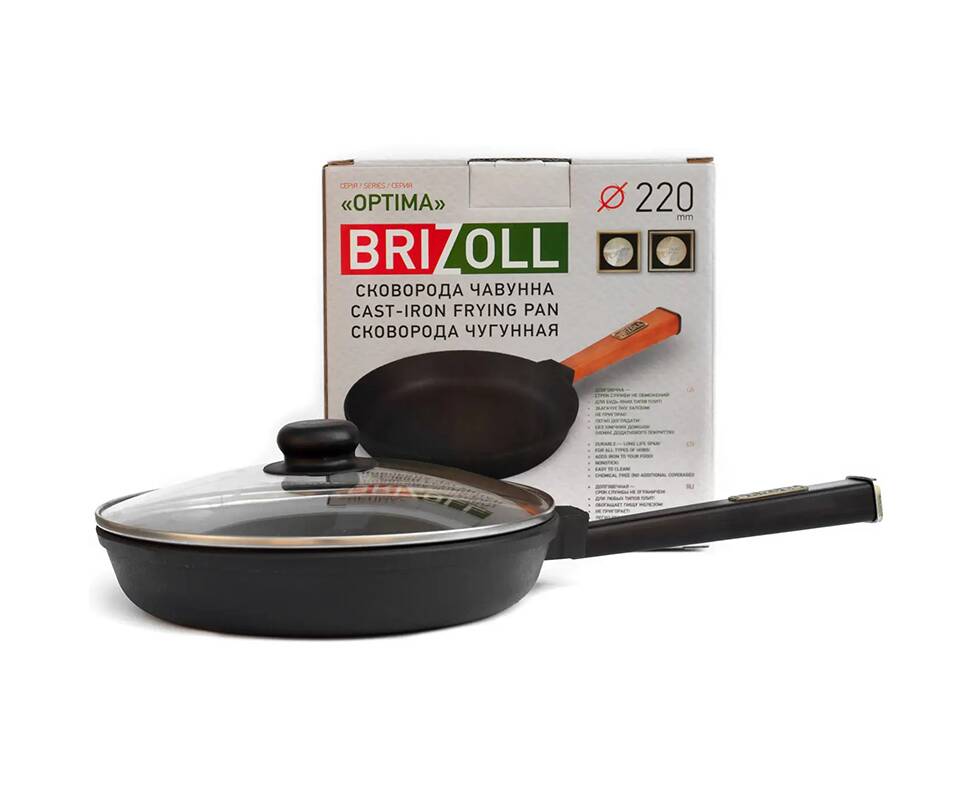 Сковорода чугунная со стеклянной крышкой 220х42,5 мм с ручкой Optima-Black Brizoll (O2240-P1-C)