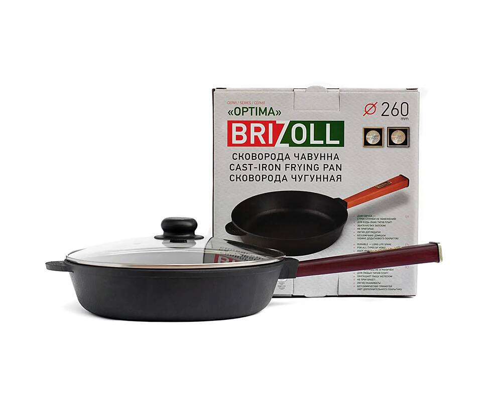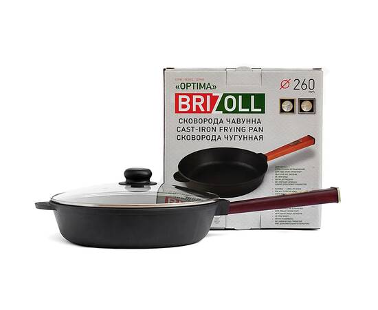 Сковорода чугунная со стеклянной крышкой 260х65,5 мм с ручкой Optima-Bordo Brizoll (O2660-P2-C)